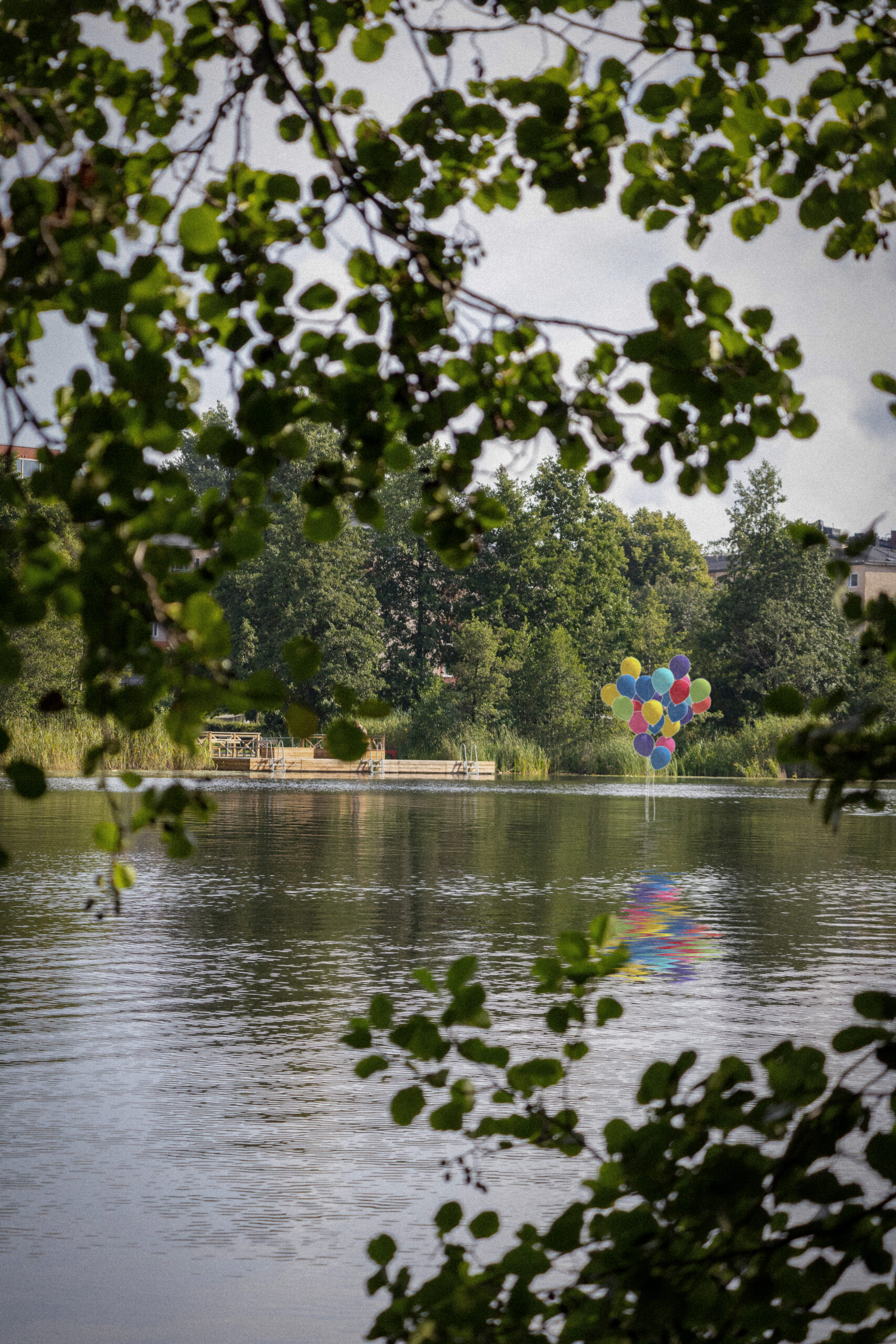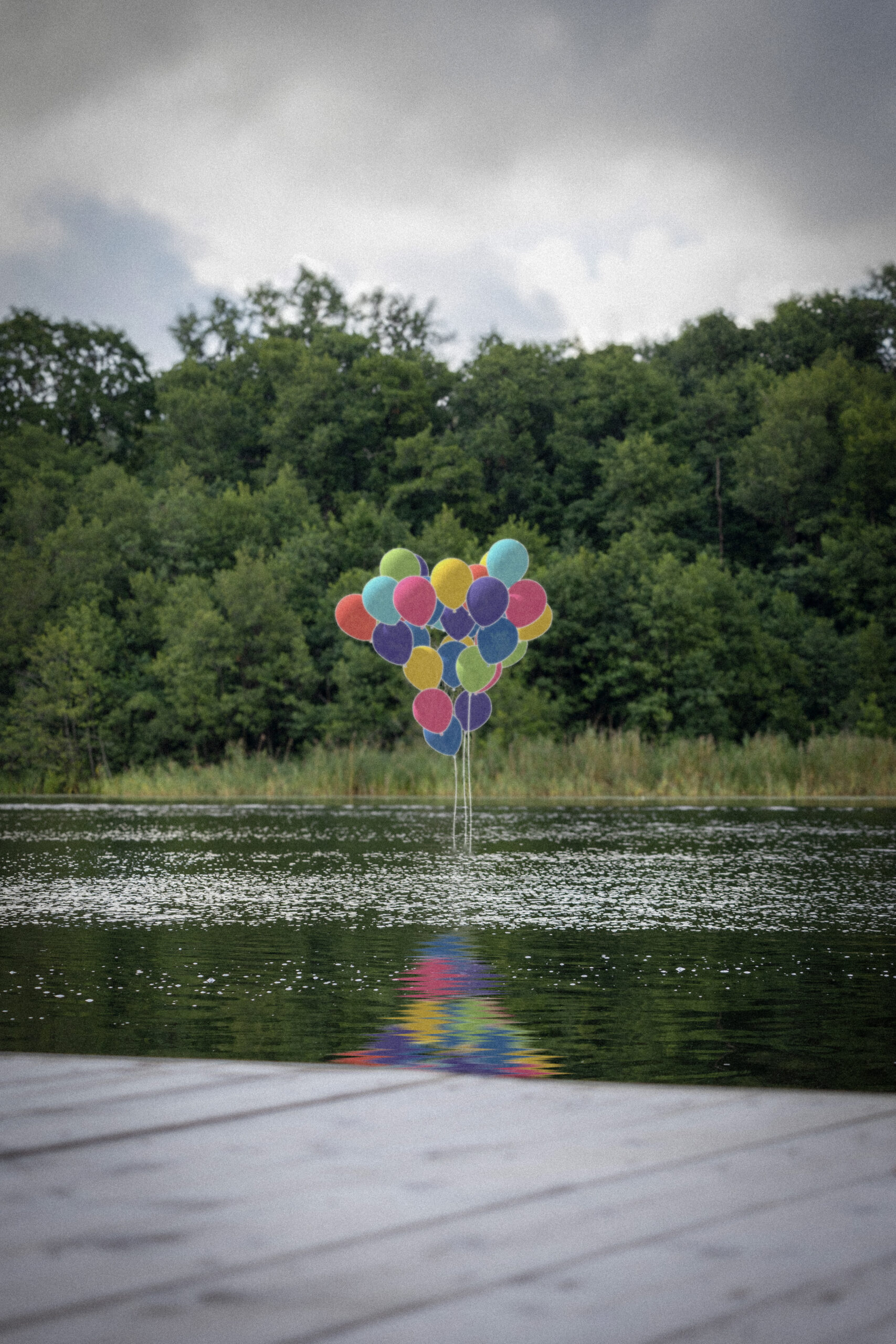 Ur Sicklasjön stiger ett knippe ballonger i en stilla explosion av färg.